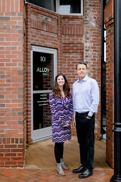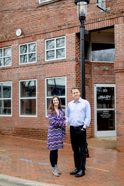 Bellomy CEO John Sessions and Alloy CEO Megan Kilpatrick outside the Alloy office on N Trade St in downtown Winston-Salem