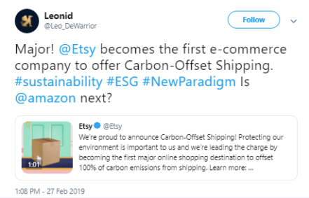 Sustainability efforts used to be optional for large companies. In Q1 2019 it was the new competitive landscapes for retail companies with high shipping volume. Many businesses are attempting to offset their carbon footprint and are beginning to realize the stakes for brand equity.