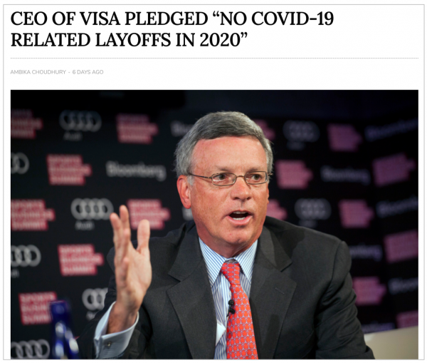 - VISA CEO reassures employees — no COVID-19-related layoffs in 2020.