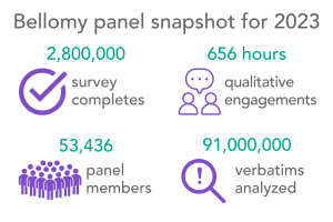 With its capacity for data collection, data analysis, and data storage, the Bellomy research tool is essential to panel management. Considering the scope of panel output (as noted earlier, 2023 projections are for 2.8 million completed surveys, 656 hours of qualitative engagements and 91 million analyzed verbatims), the Research Cloud is hugely beneficial in terms of research panel efficiency, cost-effectiveness, speed, and accuracy.