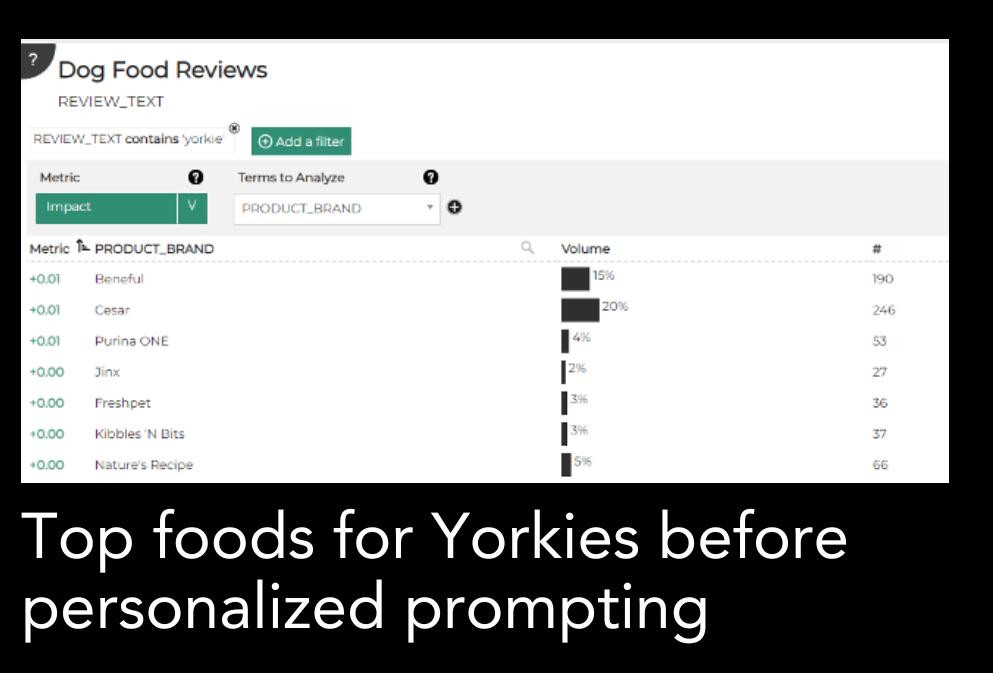 Within seconds of opening the dataset in Bellomy’s text tool, I knew that of 134,000 reviews, 1,237 specifically mentioned Yorkie or Yorkshire, and what the three highest-rated brands were among those mentions. I did this by filtering to Yorkie mentions and using the tool’s impact metric capability. The impact metric is great for quickly sorting a list of terms in a dataset because it takes not just the score (in this case a 5-point scale) into consideration but also the frequency, cutting through much of the noise in a dataset like this. (There were other brands with higher scores, but they had far fewer reviews to assess.)