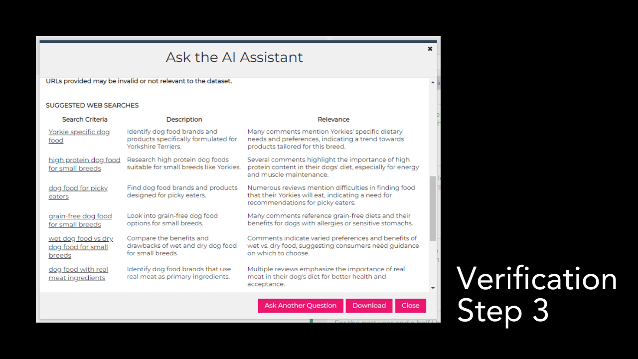 In less than 15 seconds, the AI churned through the reviews with Yorkie mentions and came back with a list of elements to consider and watch out for, pertinent consumer insights, and brands to consider. Following are some of the AI Assistant’s key findings from the reviews, and a full transcript of its output is below.